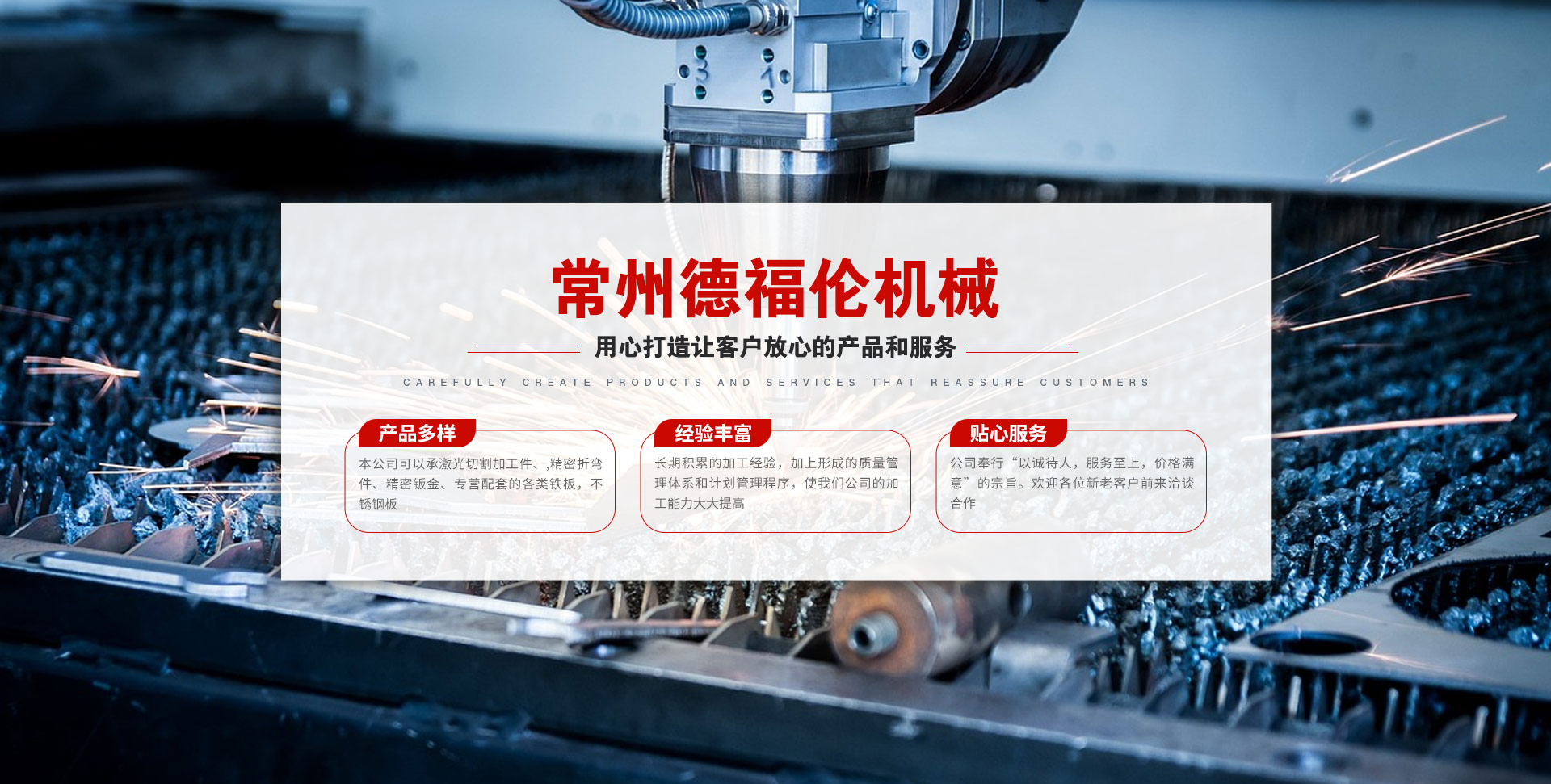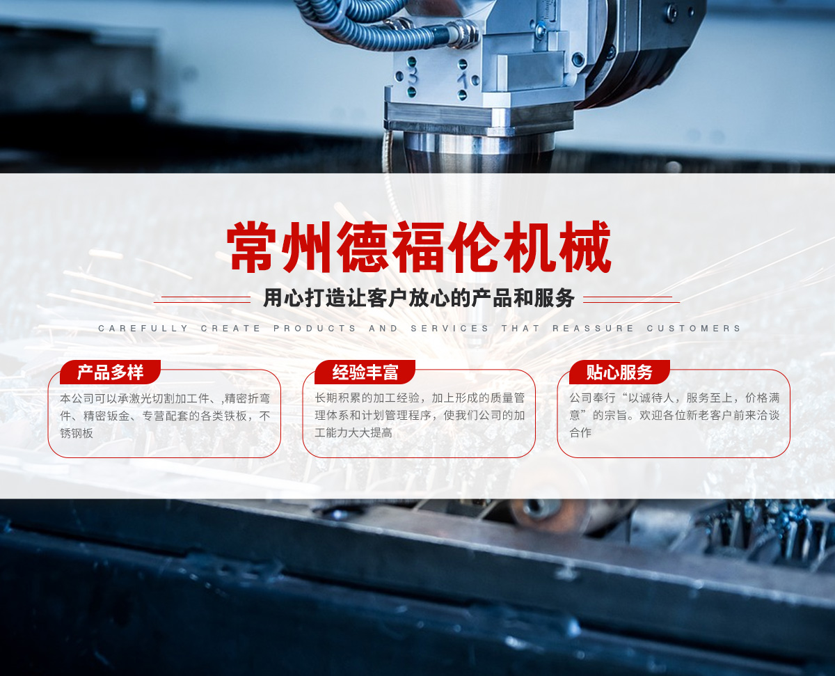 常州德福倫機(jī)械有限公司成立于2014年12月19號,位于江蘇省常州市武進(jìn)區(qū)遙觀鎮(zhèn)建農(nóng)村劍童路56號西門;公司配備;1萬瓦通K激光切割機(jī)1臺,6千瓦領(lǐng)C激光切割機(jī)1臺;機(jī)器行程6米*2.2米,切割不銹鋼50mm,碳鋼30mm;300噸大型數(shù)控折彎機(jī)。精密焊接機(jī)器數(shù)臺。本公司可以承激光切割加工件、,精密折彎件、精密鈑金、專營配套的各類鐵板,不銹鋼板。長期積累的加工經(jīng)驗(yàn),加上形成的質(zhì)量管理體系和計(jì)劃管理程序,使我們公司的加工能力大大提高,滿足客戶所需,是我們公司的目標(biāo)!公司奉行“以誠待人,服務(wù)為上,價格滿意”的宗旨。歡迎各位領(lǐng)導(dǎo);老總前來洽談合作!